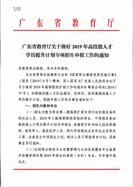 为全面贯彻全国教育大会和《国家职业教育改革实施方案》(国发〔2021〕4号)精神,深入落实《广东省人民政府办公厅关于做好2022年高职院校扩招工作的通知》(粤府办明电〔2021〕75号),加强高技能人才队伍建设,经研究,拟实施高技能人才学历提升计划,现面向社会人员(高中/中职学历)限额招收全日制大专学生。[ 查看详情 ]